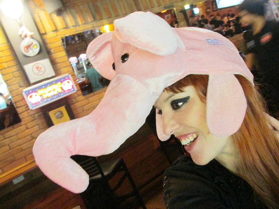 Isabela Johansen brinca com o boné estilizado, a representar o elefante símbolo da casa noturna, em questão. Show de Ciro Pessoa