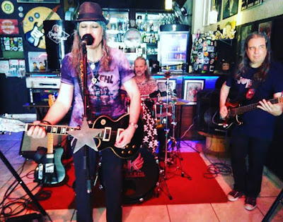 Da esquerda para a direita: Kim Kehl, Carlinhos Machado ao fundo na bateria e eu (Luiz Domingues). Os Kurandeiros ao vivo no Santa Sede Rock Bar de São Paulo, em 25 de janeiro de 2018. Click, acervo e cortesia de Ana Amb