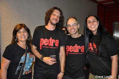 Após o término do show, com o auditório do teatro sem a presença do público, uma foto posada para a posteridade. Da esquerda para a direita: eu (Luiz Domingues), Rodrigo Hid, Ivan Scartezini e Xando Zupo. Pedra no Sesc Belenzinho de São Paulo, em 5 de abril de 2019. Click, acervo e cortesia: Grace Lagôa